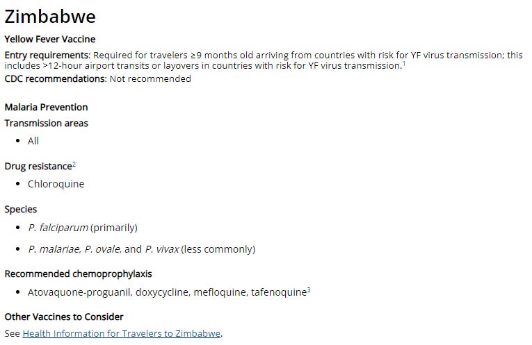 Mefloquine prescribed for a Safari trip to Zimbabwe six-months prior to celebrate their 30th wedding anniversary. The CDC Yellow Book in 2024 still states you should take mefloquine for Zimbabwe: