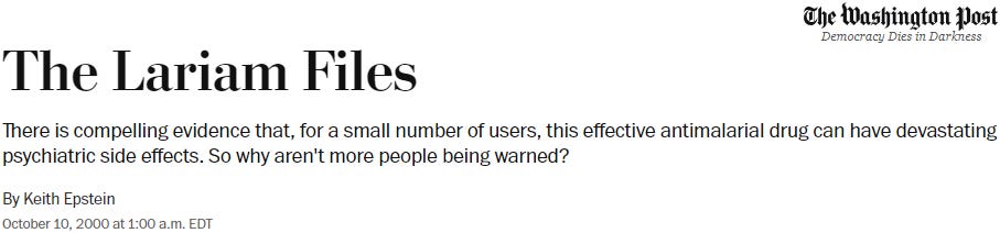 Epstein, K (10.10.2000) The Lariam Files [https://www.washingtonpost.com/archive/lifestyle/wellness/2000/10/10/the-lariam-files/632d355e-33a2-41d0-b76a-c876938fa813/] The Washington Post. Page accessed 12.05.2024