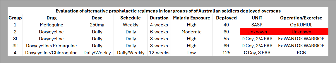 Via Professor Karl Rieckmann and The Medical Journal of Australia (1993). Recent military experience with malaria chemophylaxis. Excerpt: